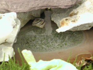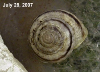 Yes, Oreo survived another winter, spring and is now well into summer. He is hibernating for longer periods of time now (up to 34 days). Oreo only stays active (on and off) for a day or two - never more now! Could it be he/she's getting old? I do not know how long this species lives nor do I have any way of telling how old Oreo was when it was adopted back on August 23, 2004. I must admit that at times I think he has died, but, there is a sure way of bringing him out of hibernation - Move him on to a rock or moss them place a few drops of pure water on him. He always wakes up within 12 to 24 hours. Seldom does he stay awake more than a few hours when awakened in this way unless he has slept for at least two weeks. As usual when awakening Oreo goes directly to the roof of his/her pen to drink up the condensation found there (he has never taken water from a container lid). Oreo then samples his food supply: lettuce, corn starch (a new favorite), and still his all-time favorite - oatmeal porridge. Spring brought on the dandelion blooms as well which he really enjoys. It is hard to see if Oreo has grown any more shell. Other than the lengthening periods of hibernation there is very little more to say. |
